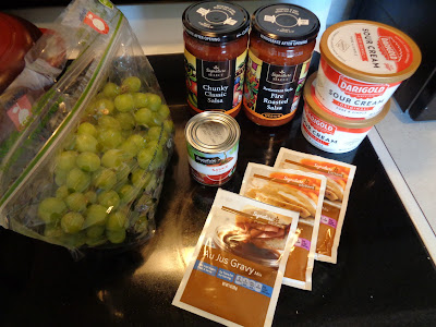 a jar, sour cream for 89¢ each and grapes for the girls at 99¢ a pound.